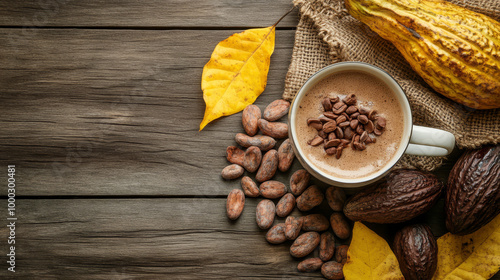 Hot cocoa drink or chocolate drink with cacao pod and cocoa beans on wooden table , top view