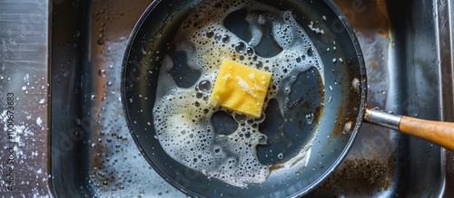 Dirty Frying Pan With Sponge In Kitchen Sink Above View