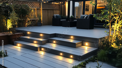 Taras z kompozytowych desek w eleganckim odcieniu. Delikatne oświetlenie wbudowane w deski dodaje uroku wieczornym spotkaniom na świeżym powietrzu.
