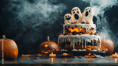 Na tle mrocznej scenerii, tort w kształcie krzyczącego ducha przyciąga wzrok gości Halloweenowej imprezy.