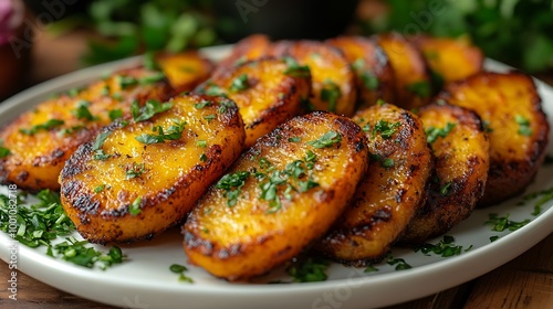 Crispy roasted potato slices with herbs on a white plate.