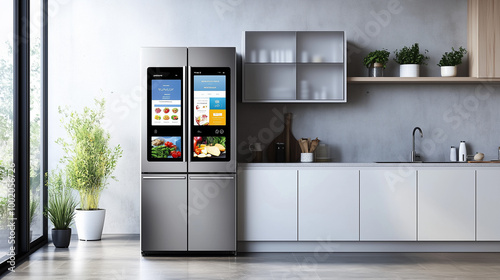 Smart Refrigerator in a Modern Kitchen. A sleek smart refrigerator with touch screen functionality in a modern, minimalist kitchen interior.