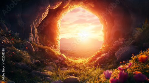 Pusty grób w świetle wschodzącego słońca, symbolizujący zmartwychwstanie i nadzieję, jest centralnym elementem historii wielkanocnej.