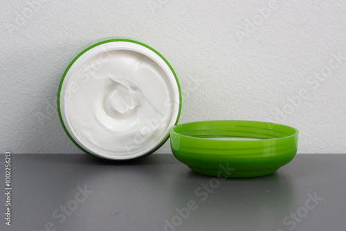 biały krem do twarzy w zielonym okrągłym słoiczku