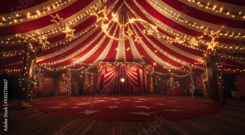 Circus tent with a red and white striped pattern, with stars painted on the ceiling, surrounded by fairy lights. The scene is illuminated by warm light