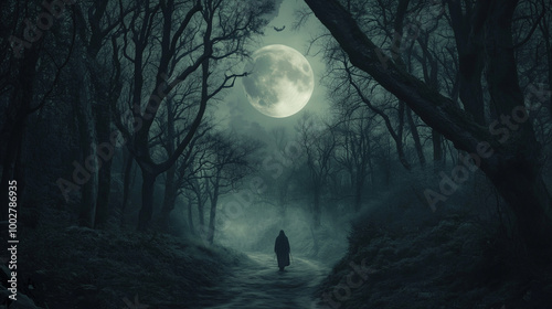 The Haunted Path: Describe a traveler lost in a dark forest on Halloween night. The full moon illuminates eerie figures lurking among the trees, and whispers echo through the air.