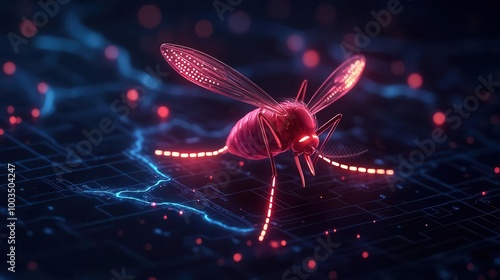Abstract visualization of a mosquito outbreak spreading like wildfire across a map, symbolizing rapid disease spread, outbreak mapping, insect threat