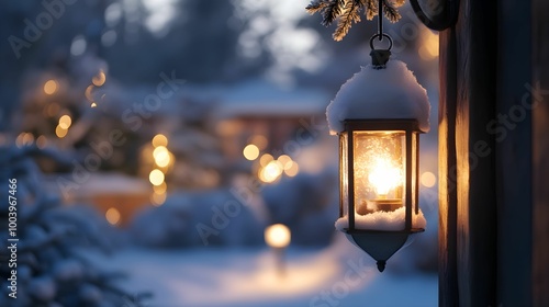latarnia, śnieg, zimowy wieczór, oświetlenie, zimowy ogród, zasypany śniegiem, drewniany ganek, zimowa sceneria, śnieżne drzewa, firanki, świąteczny klimat, zimowy wieczór, lampion, oświetlony ganek,