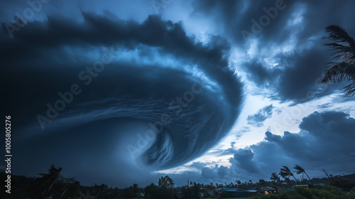 A large storm cloud is rolling in over a town. The sky is dark and ominous, and the clouds are thick and heavy. Scene is tense and foreboding, as if something terrible is about to happen