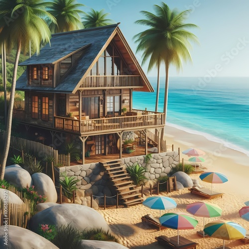 A beach house situated by the ocean.