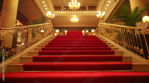 Czerwony dywan rozpościera się na scenie prowadząc do maroonowych schodów, które błyszczą w blasku reflektorów.