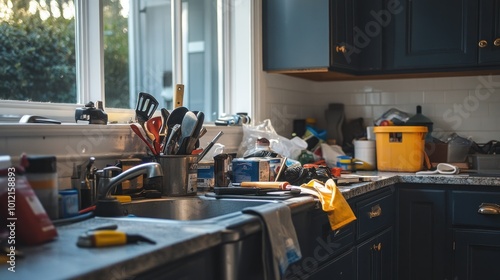 A cluttered kitchen sink area filled with utensils, trash, and cleaning supplies.