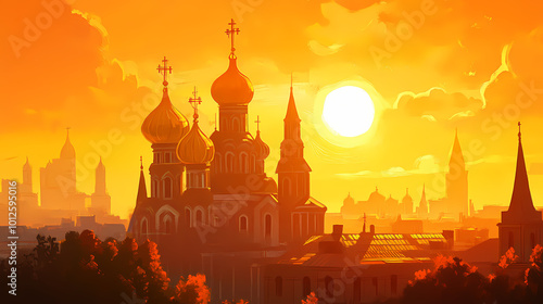 Ancient russian orthodox cathedral with towering dome and cross, bathed in the golden glow of the setting sun against a backdrop of a bustling city. Russian Cathedral. Illustration