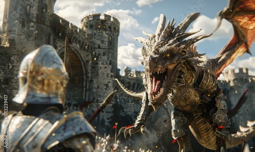 Knights in shining armor defending a castle from a dragon attack, 4K hyperrealistic photo