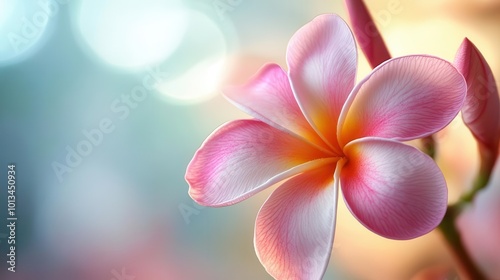 tropical flower serenity close-up of a delicate frangipani blossom with soft focus petals against a dreamy, pastel background. gentle lighting enhances the flower's natural beauty.