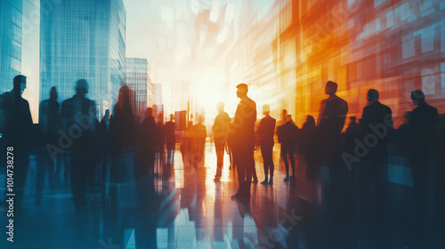 Zespół ludzi biznesu w trakcie ważnego spotkania. Ich postacie są subtelnie zintegrowane z tłem miejskiego krajobrazu, gdzie dominują nowoczesne biurowce.