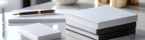 fashion editorial of Close-up of business cards stacked next to a modern fountain pen and a planner, all set on a white table to evoke a sense of readiness