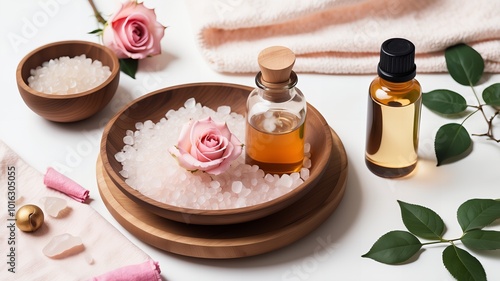 Motyw spa i wellness, miska wypełnione grubymi, białymi solami kąpielowymi, z których jedna ma różową różę umieszczoną na górze. Różowe róże i kilka zielonych liści, biały ręcznik.
