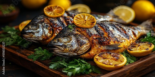 Dos pescados a la parrilla adornados con rodajas de limón y perejil, dispuestos sobre una tabla de madera.