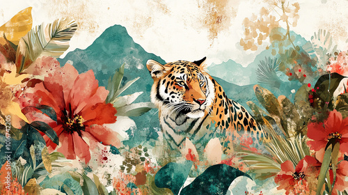 Pastelowa tekstura, tygrys i abstrakcyjne kwiaty, tło dla projektu generative ai