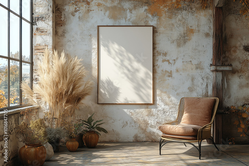 Surowe, loftowe wnętrze z fotelem i suchą trawą pampasową. Na ścianie wisi pusta ramka obrazu. Całość oświetlona naturalnym światłem.