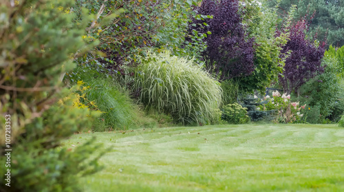Świeżo skoszony trawnik otoczony roślinami ozdobnymi o różnej wybranej wysokości - tworzący przestrzenną granicę ogrodu. Umiejętnie i fachowo (i ze smakiem!) dobrane rośliny podkreślające przestrzeń