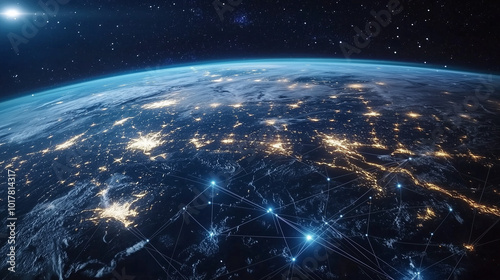 Zaawansowana sieć komunikacyjna, która łączy cały świat poprzez nowoczesne technologie. W centrum znajduje się kulista planeta Ziemia, z której wychodzą świetliste linie.