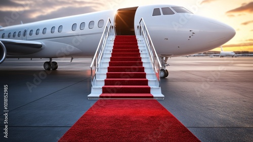 Red carpet on the stairs leading to the luxury airplane. 3d rendering.