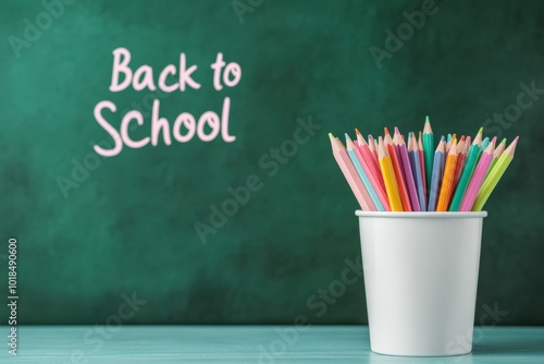 Colorful pencils in a cup with a Back to School message on a green chalkboard.