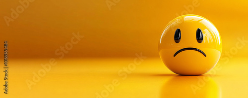 Sad face emoji on a yellow background, business concept banner with copy space, symbolizing negativity and bad mood.