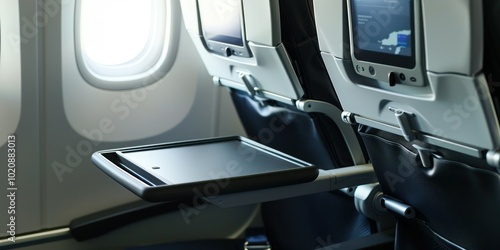 >Fototapety>Close-up of a passenger seat on an airplane with a tray table and entertainment screen