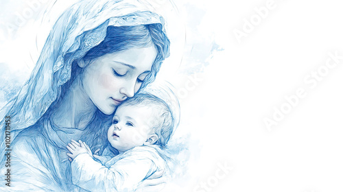 Madonna and Child with Halo in Blue Hand-Drawn Art
