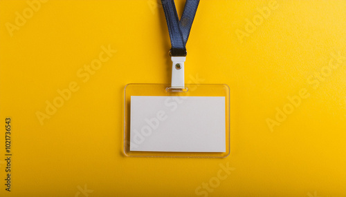 Blank office badge, empty name tag on bright yellow backdrop. Mock-up.