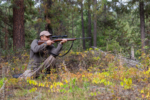 Hunter in kneeling position aiming his rifle at game while looking through the scope. Ready to shoot. Side view.