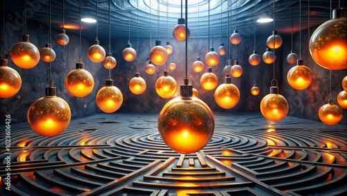 Glowing peach orbs suspended within a charcoal labyrinth, reflecting the light of hidden truths