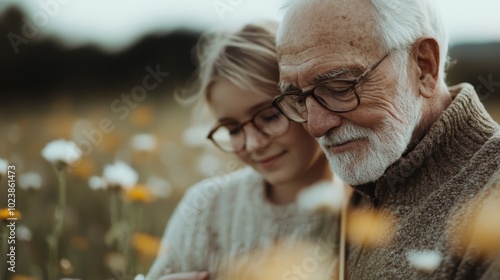 An elderly man and a young woman share a tender embrace amidst a meadow of wildflowers, portraying family bonds, love, and generational connection in nature.