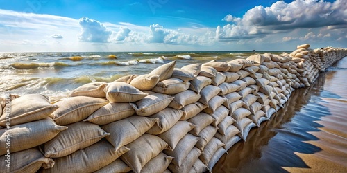 Large sandbags on tilted angle by ocean to prevent flooding