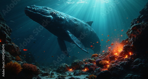 Podwodny świat raf koralowych w okolicach aktywnych sejsmicznie. Widoczne pęknięcia skał z wypływem gorącej magmy. Widzimy kolorowe rybki i stworzenia wodne. Na pierwszym planie wieloryb.