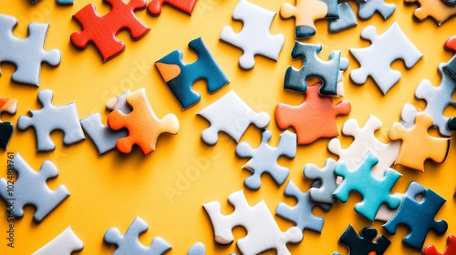 Colorful puzzle pieces dispersed on bright yellow background, creating a playful visual concept