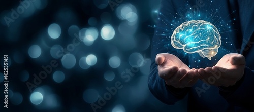 Businessman holding a glowing brain hologram with a dark blue background and bokeh effect, representing AI technology concept in high resolution.