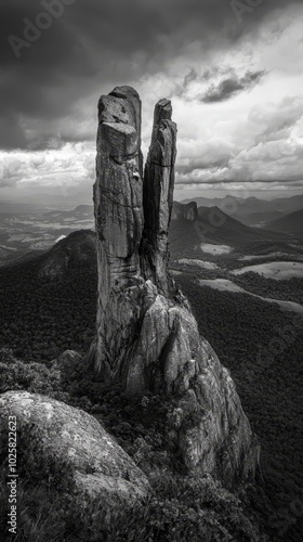 A monochrome image of a rock formation, situated in a mountain range, under a sky filled with clouds