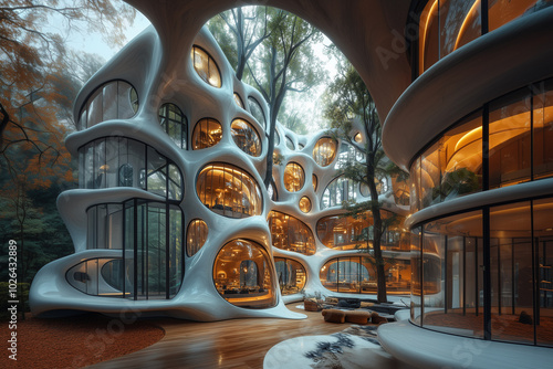 Surrealistyczna architektura o organicznych kształtach, przypominających komórki, wtopiona w leśne otoczenie. Wnętrza są oświetlone ciepłym, pomarańczowym światłem.