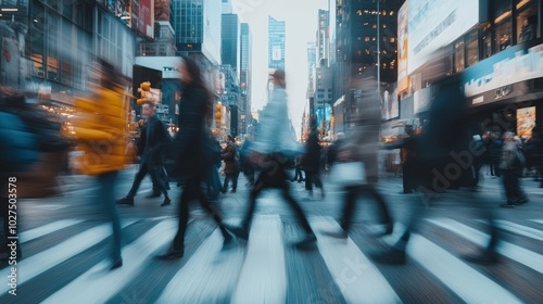 Blurred people crossing the street, featuring pedestrians in motion as they cross a city street, symbolizing the rush of daily life.