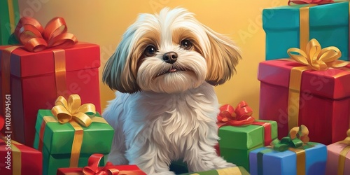 Playful Lhasa Apso puppy, 1 year old, nestled among colorful Christmas gifts, festive pet portrait