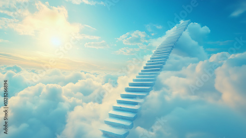 W malowniczym krajobrazie drabina sięga wysoko, prowadząc w stronę chmur. Wyjątkowa kompozycja wizualna ilustruje koncepcję wzrostu i dążenia do lepszej przyszłości.