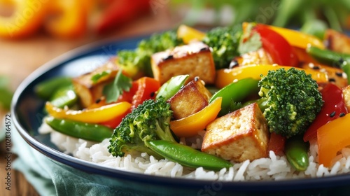 A plate of tofu stir-fry with vegetables and rice, served on a blue plate.