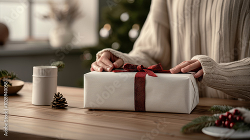 close up of beautifully wrapped Christmas gift being unwrapped, surrounded by festive decorations and cozy atmosphere. scene evokes warmth and holiday spirit