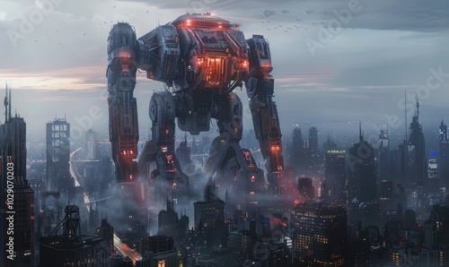 Giant robot defending a futuristic cityscape, 4K hyperrealistic photo.