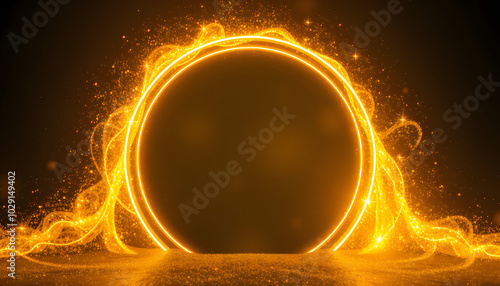 Golden or yellow magical fantasy portal. Round light frame, with fine dust particles, futuristic teleporter. Golden neon lights illuminate night scene with sparkles. Lighting effect. PNG isolated wi
