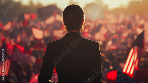 W centrum uwagi znajduje się kobieta, kandydatka na prezydenta, która z pasją wygłasza przemówienie na wiecu wyborczym.